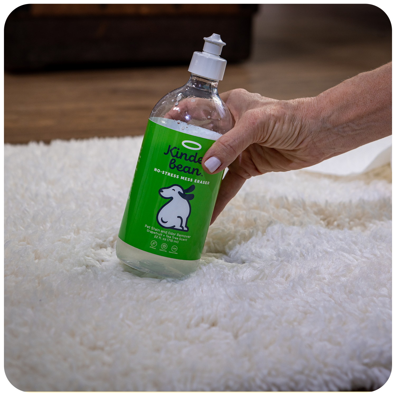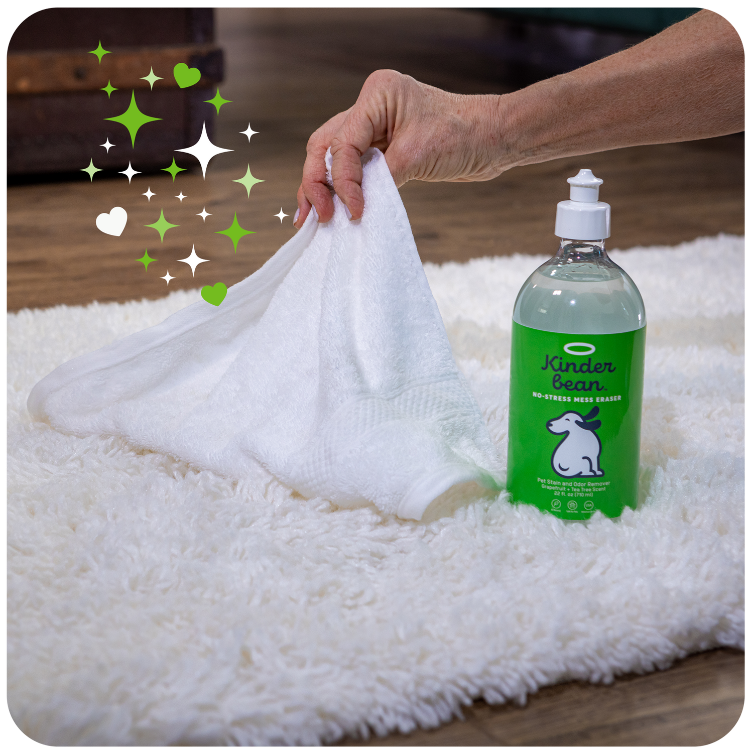 Soak soiled soft goods in a 1:10 ratio Kinderbean to water before regular wash cycle to remove pet stains and odors.